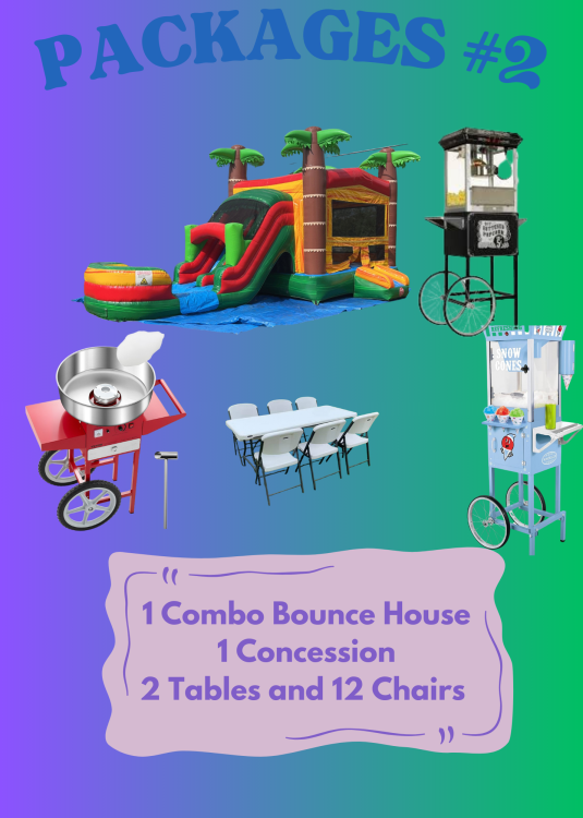 Choose ONE Included ConcessionPackage #2:Choose ONE Included Concession1Dropdown12824587_28247990111"Choose ONE Included Concession offers a bonus add-on with your rental—a chance to pick one complimentary perk, like a snack or treat, that can sweeten the overall experience at your event." Cotton Candy Machine with Cart PackagePackage #2:Cotton Candy Machine with Cart Package102824587_2824799_28356490100Rent this Cotton Candy Machine with Cart for an event full of fun and flair. It’s a self-contained setup that whips up delicious, fluffy cotton candy on demand while its handy cart makes it easy to move wherever the party takes you. Simple to operate and visually appealing, it adds a sweet touch to any celebration. Includes up to 30 Servings. Popcorn Machine PackagePackage #2:Popcorn Machine Package102824587_2824799_28356450100Elevate your event with this popcorn machine rental—a lively, easy-to-use appliance that transforms simple kernels into a delicious, freshly popped treat. Perfect for parties or movie nights, it brings an extra layer of fun and a nostalgic touch that turns any gathering into a mini-carnival. Included Supplies up to 30 guest Snow Cone Machine PackagePackage #2:Snow Cone Machine Package102824587_2824799_28336750100